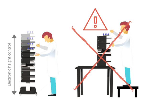 La plupart des opérateurs utilisent actuellement un escabeau pour atteindre le sommet du système HPLC/UHPL pour avoir accès au solvant.