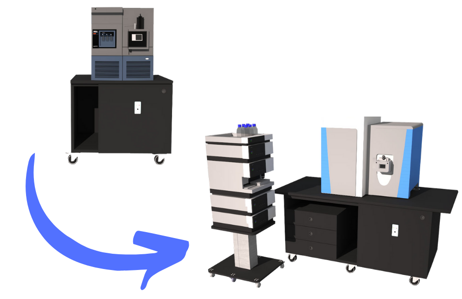 En utilisant une table élévatrice et mobile ionBench LC sur votre MS, si vous avez besoin de réinjecter votre échantillon sur une autre marque de spectromètre de masse. Il suffit de déplacer le LC sur l'autre MS et de relancer l’exécution en 10 minutes.